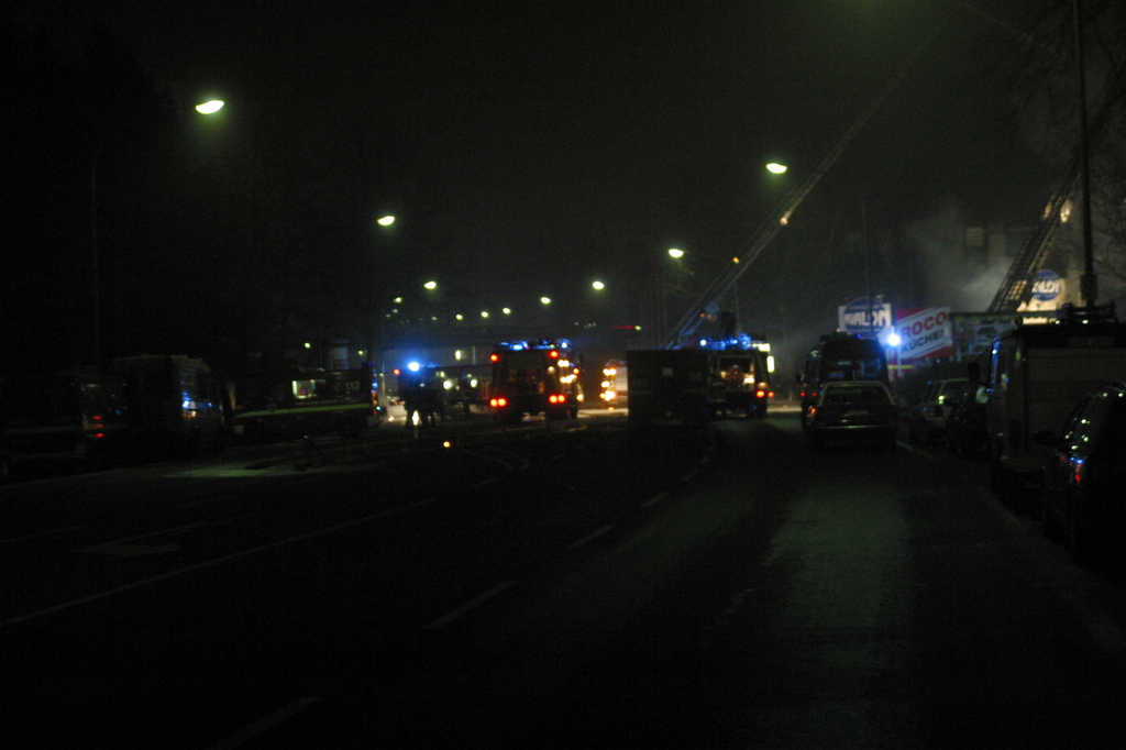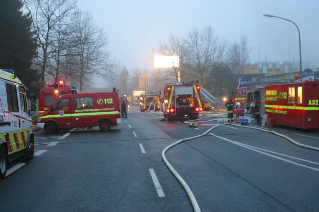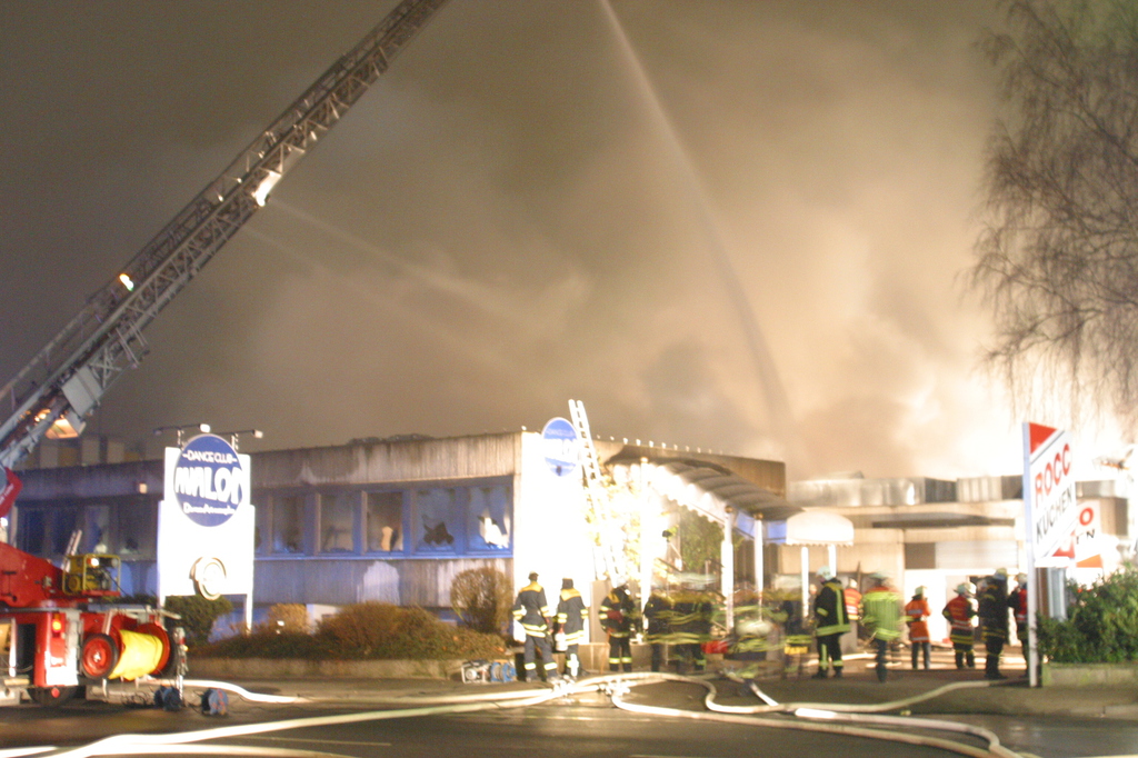 Erneut ein Feuer in einer Diskothek im Schinkel. Beim Eintreffen der BF und der FF Schinkel schlugen die Flammen weithin sichtbar in den Himmel. Im ersten Angriff wurden von der Rückseite ein Wasserwerfer der DLK, ein B-Rohr im Außenangriff und zwei C-Rohre vorgenommen. Zur Verstärkung wurden noch die FF Neustadt, FF Stadtmitte, FF Voxtrup und die FF Eversburg nach und nach zur Einsatzstelle alarmiert und die FF Haste besetzte die Hauptfeuerwache, so dass ein massiver Löschangriff über drei Wenderohre der DLK's und bis zu zehn C-Rohre vorgenommen werden konnte. Im Verlauf der Löscharbeiten stürzte ein Großteil der Dachfläche ein. Um die verbliebenen Glutnester zu ersticken, wurde auch Löschschaum eingesetzt.