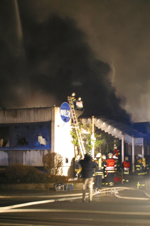 Zum zweiten Mal innerhalb von sechs Wochen wurde auf eine Großdiskothek ein Brandanschlag verübt. Es wurden ca. 150 Liter Brandbeschleuniger im Inneren der Disko verschüttet. Beim Eintreffen der BF und der FF Schinkel schlugen die Flammen aus dem Dach. Im Eingangsbereich wurde eine starke Rauchentwicklung festgestellt. Nach dem gewaltsamen Eindringen in die Disko, wurde parallel zum Innenangriff von drei Trupps unter Atemschutz eine Brandbekämpfung über Drehleiter im Außenangriff durchgeführt. Zur Unterstützung wurde noch die FF Haste zur Einsatzstelle und die FF Neustadt zur Besetzung der BF Wache alarmiert.