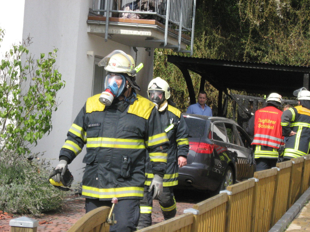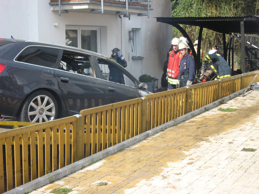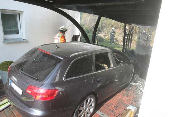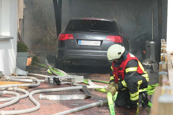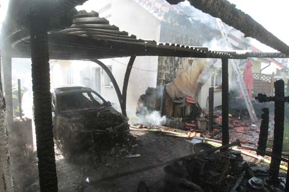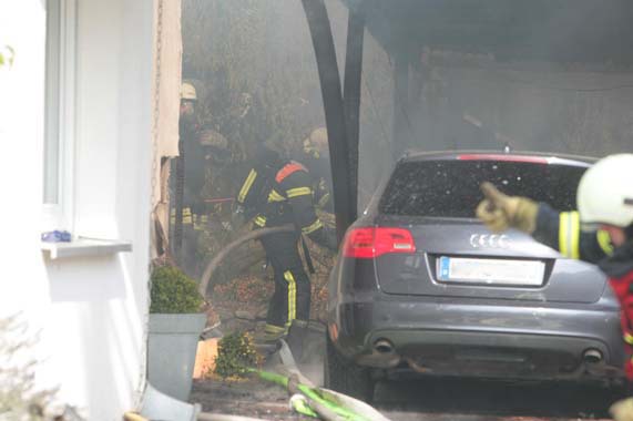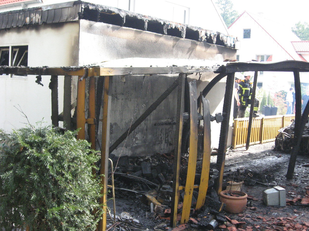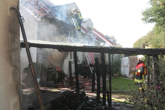 Es brannte ein Carport an einem Einfamilienhaus. Noch vor Eintreffen der Feuerwehr breitete sich das Feuer auf den Dachstuhl des Einfamilienhauses und eine nebenstehende Doppelgarage aus. Das Feuer wurde mit zwei Hohlstrahlrohren und einem Hochdruckrohr gelöscht. Ein weiteres Hohlstrahlrohr wurde zur Kühlung dreier Gasflaschen eingesetzt. Im Einsatz waren insgesamt fünf Trupps unter PA und drei weitere Trupps mit Filtergerät. |