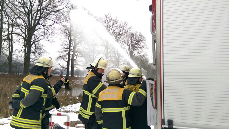 Dieses mal trafen wir uns bereits um 9:00 Uhr mit acht Teilnehmern am Feuerwehrhaus und besetzten das LF 20/10. Zunächst einmal machten wir einen ausführlichen Fahrzeugcheck, in dem wir alle Geräte auf Vollständigkeit und Funktion überprüften. Nachdem keine Mängel festgestellt wurden begaben wir uns zum nächsten Übungsort, einem Regenrückhaltebecken mit Ansaugstutzen. Hier nahmen wir uns nun unsere Feuerlöschkreiselpumpe im Heck des Fahrzeuges in Betrieb und testeten alle Möglichkeiten der Wasseraufnahme und Abgabe mit gleichzeitiger Funktionsüberprüfung der Ansaugstutzen. Unsere zweite Pumpe, die sogenannte Tragkraftspritze, haben wir anschließend ebenfalls durch Ansaugen aus dem zweiten Stutzen getestet. Trotz einer dicken Eisschicht auf dem Wasser und Temperaturen weit unter Null Grad gab es keinerlei Probleme bei der ganzen Aktion. Da wir nun schon über zwei Stunden unterwegs waren, stärkten wir uns danach erst einmal mit Kaffee und Brötchen. Für unsere Fahrer an Bord unseres LF hieß es nun das Fahrverhalten in unwegsamen Gelände zu testen. Da das Fahrzeug allerdings Allrad besitzt und unsere Fahrer sehr umsichtig waren, wurde auch dieses mit Bravur gemeistert. Unsere letzte Station war die ehemalige Kaserne am Limberg. Da wir hier gut asphaltierte und wenig frequentierte Straßen zur Verfügung haben, konnten wir hier ideal das Verlegen von Schläuchen während der Fahrt üben . Dazu begaben sich jeweils zwei Personen auf die Tritte am Heck des Fahrzeuges, sicherten sich mit Feuerwehrsicherheitsgurten an den dort angebrachten Ösen und unterstützten das herauslaufen der B – Schläuche die sich in Kästen oberhalb der Heckpumpe befinden. Nur das Befüllen der Kästen hinterher ist etwas problematischer und zeitaufwendiger. Danach ging es zurück zum Feuerwehrhaus wo wir das LF noch von Innen reinigten so das pünktlich 14:00 Uhr unser Dienst beendet war.