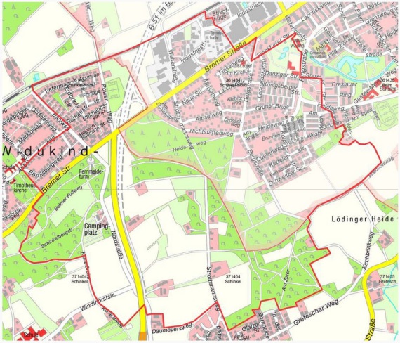 Frankfurter Straße 11 - 17, Grüner Brink, Heideweg 37 - 100, Humboldweg, Industriestraße 9 - 50, Kettlerstraße, Kiebitzweg, Königsbergerstraße, Kolpingstraße, Lerchenstraße, Leonardskamp, Meisenweg,