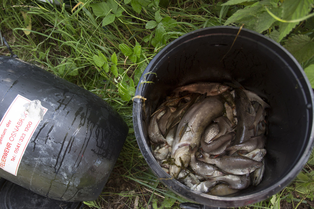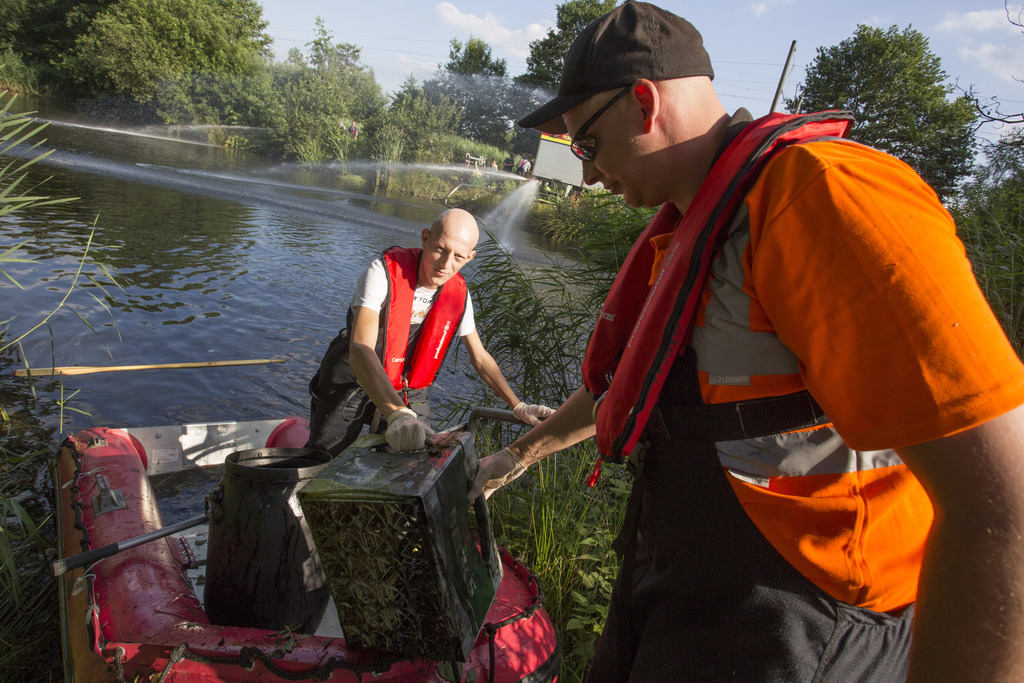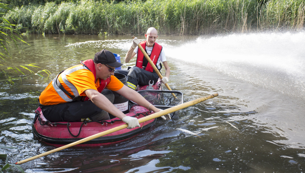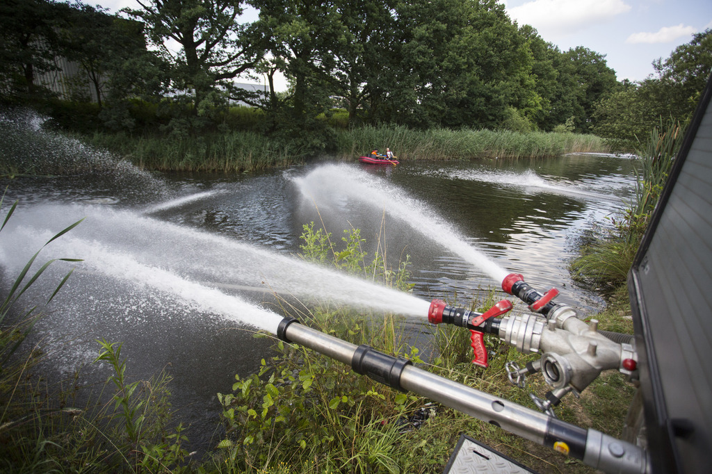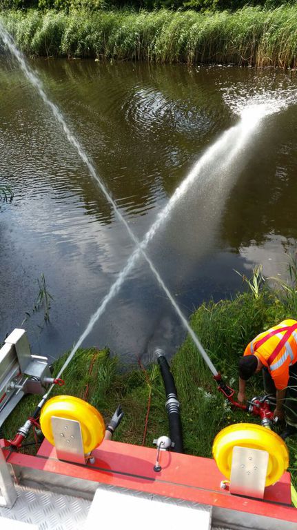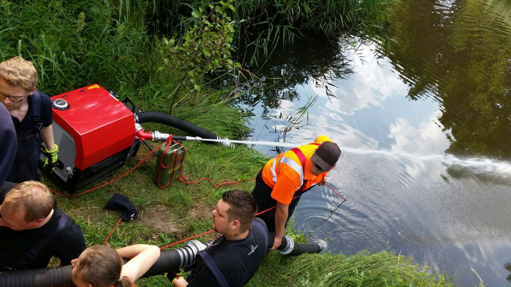 12.07.2015|Gemeinsam mit der FF Voxtrup leistete die FF Schinkel Amtshilfe für die Stadt Osnabrück. Bei einem großen Regenrückhaltebecken kam es aufgrund der heißen Witterung zu einem Fischsterben durch Sauerstoffmangel im Wasser.