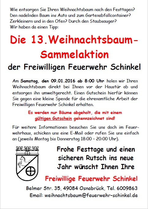 Am Montag nach dem ersten Advent begannen die Jugendfeuerwehr und die Mitglieder der Einsatzabteilung der Feuerwehr Schinkel traditionell mit der Verteilung der Abholgutscheine für die ausgedienten Weihnachtsbäume. Diese Abholgutscheine werden im Löschbezirk der Feuerwehr Schinkel gegen eine freiwillige Spende an viele Haushalte verteilt. Leider schaffen wir in der Zeit bis zur Weihnachtswoche nicht alle Haushalte. Für die Anwohner, die wir nicht persönlich erreichen konnten, gibt es einen Infoflyer in den Briefkasten. Denn die Abholgutscheine können auch an vier Tagen pro Woche in den Abendstunden im Feuerwehrhaus Schinkel erstanden werden.