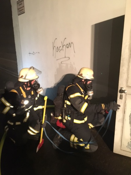 Nach Eintreffen der FFw Hagen a. T. W. wurde ein zweiter Angriffsweg am unteren Teil des Gebäudes vorgenommen. Von dort aus ging ein zweiter Trupp unter PA zur Personenrettung/ Brandbekämpfung vor.