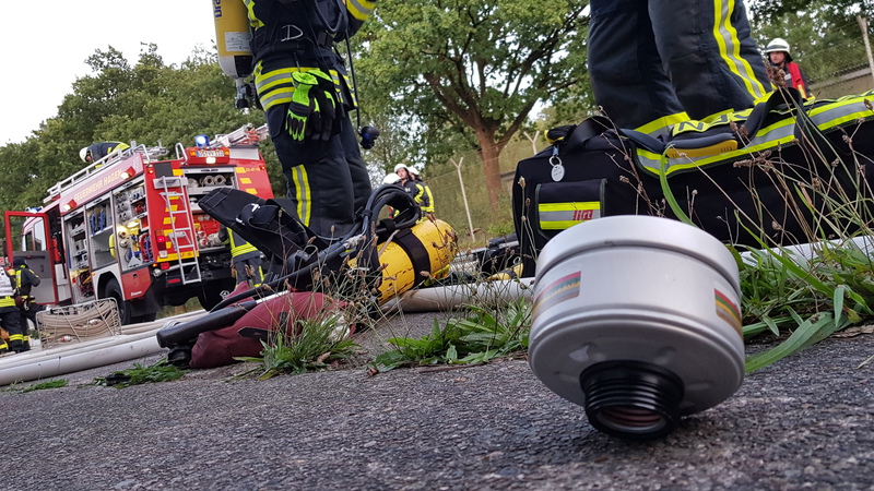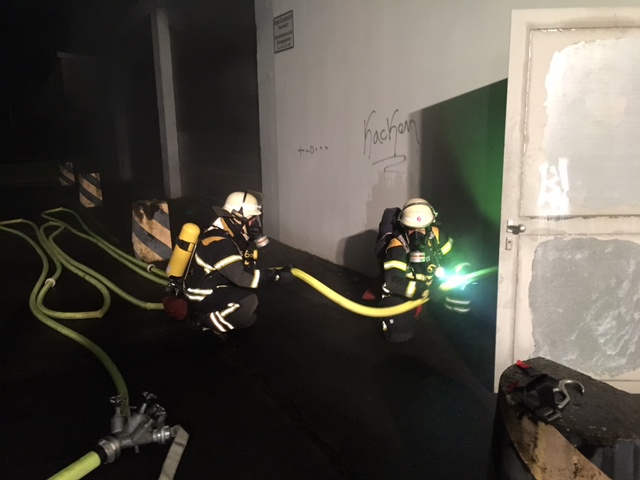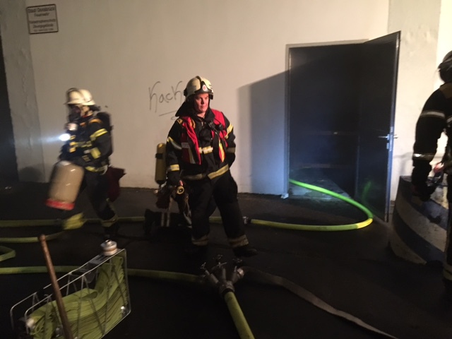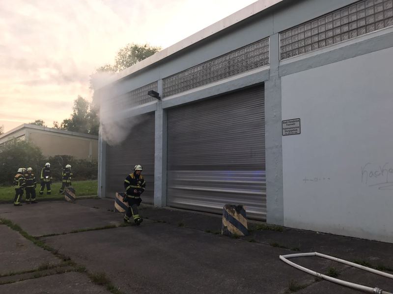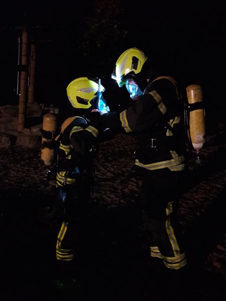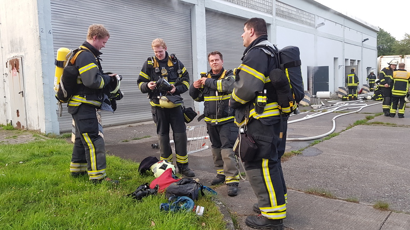 Auf der Anfahrt konnten die Besatzungen von TLF 16/25 und LF 20/10 trotz der Dunkelheit bereits eine starke Rauchsäule ausmachen. Mit insgesamt drei Trupps unter Atemschutz wurde zunächst die Fahrzeughalle der Feuerwehr am Limberg systematisch auf mindestens eine defenitiv vermisste Person durchsucht und die Brandbekämpfung eingeleitet. Insgesamt wurden zwei Personen aus dem Gebäudekomplex gerettet und ein Verletztensammelplatz eingerichtet. Das LF 20/10 stellte zusätzlich die Wasserversorgung sicher. Im Laufe der Übung wurden mehrere Gasflaschen sichergestellt und gekühlt.
