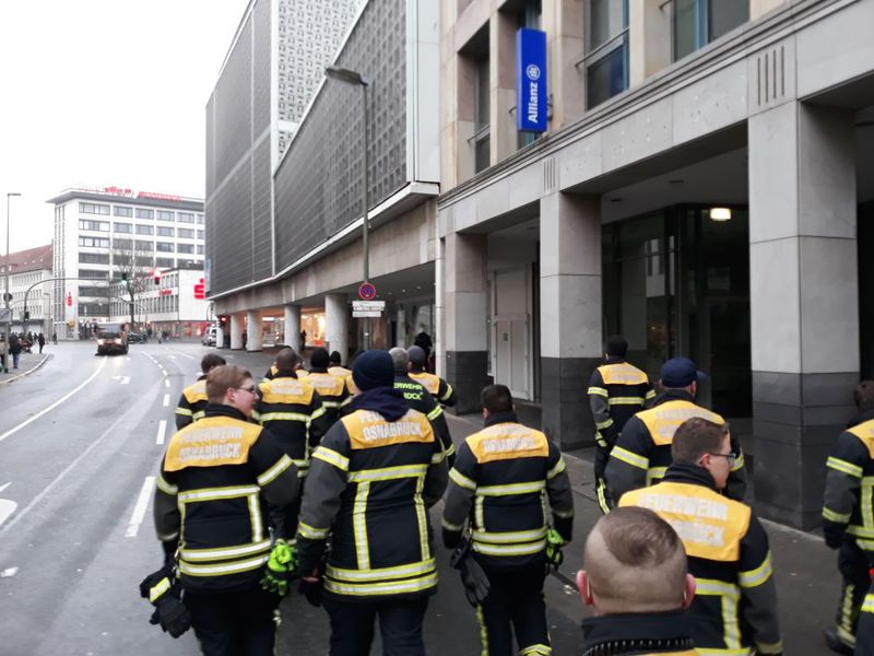 20.02.2018 | Auch in diesem Jahr hieß es für die Ortsfeuerwehr Schinkel wieder einmal "Osna-Helau" beim traditionellen Karnevalsumzug am Ossensamstag. Wie schon in den Jahren zuvor wurden wir in einem Teilstück des ca. 3 Kilometer langen Umzuges zur Streckensicherung eingesetzt. Nachdem wir uns um halb Eins mit 11 Leuten im Feuerwehrhaus eingefunden hatten, starteten wir in Richtung Innenstadt um pünktlich um 13 Uhr zur Lagebesprechung am Einsatzleitwagen am Kollegienwall zu sein. Anschließend wurde uns unser Abschnitt zugeteilt. Hier wurden wir, wie auch schon in den Jahren zuvor, auf der Herrenteichstraße zwischen Haarmannsbrunnen und L+T eingesetzt. Auch alle anderen Osnabrücker Ortsfeuerwehren, mehrere THW Ortsverbände und Rettungsdienstorganisationen waren mit im Einsatz. Alle zusammen sorgten dafür das der Karnevalstross mit rund 100 Wagen und Fußgruppen ohne besondere Vorkommnisse zwischen Rosenplatz und Rathaus rollen konnte. Rund 20.000 begeisterte Jecken feierten entlang der Zugstrecke mit und sorgten für einen gelungenen Ossensamstag.