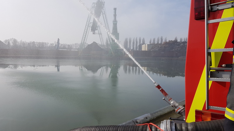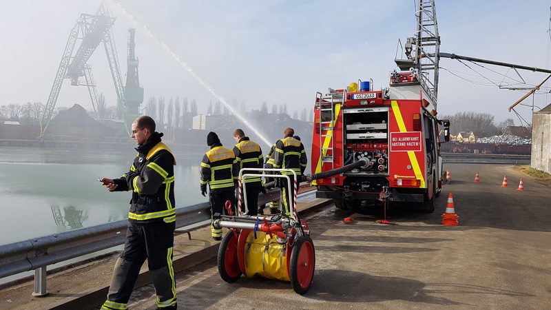 Gemeinsam mit Kräften der Feuerwehren Bad Essen und Wallenhorst wurden zwei Ölsperren im Bereich des Wendebeckens im Osnabrücker Hafen gesetzt. Des weiteren wurde der Ölsanimat in Betrieb genommen. Mittels zweier Feuerwehrboote wurde geübt, eine Wasserverunreinigung mit Mehrwegölschlengeln "einzukesseln" und Richtung Ölsanimat zu lenken.