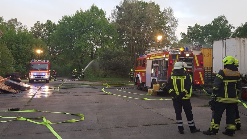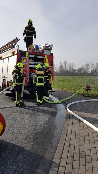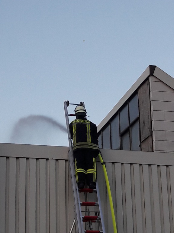 07.05.2018 | Am heutigen Dienstabend (02.05.18) der FF Schinkel stand das Thema Zugübung auf dem Programm, beim dem alle Fahrzeuge wie bei einem richtigen Alarm zeitversetzt nacheinander am Einsatzort ankamen. Angenommen wurde der Brand eines Wohn- und Hallenkomplexes mit Übergriff auf den Außenbereich. Zunächst traf unser TLF am Ort des Geschehens ein und der erste PA-Trupp ging über eine tragbare Leiter mit einem C-Rohr in eine brennende Wohnung oberhalb des Hallenkomplexes vor. Zeitgleich öffnete ein weiterer Trupp mit einem Trennschleifer ein Hallentor. Hier stand ein weiterer PA-Trupp mit einem weiteren C-Rohr in Bereitstellung. Auch das Löschgruppenfahrzeug sowie der Mannschaftstransportwagen waren mittlerweile eingetroffen und bekamen den Auftrag ein neben der Halle befindlichen Sperrmüllhaufen abzulöschen und ein Schaumrohr sowie ein Hydroschild auf nebenstehende Container vorzunehmen. Parallel dazu wurde eine ca. 200 Meter lange Wasserversorgung aufgebaut und eine Straßenabsicherung vorgenommen.