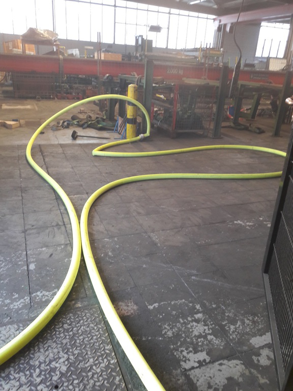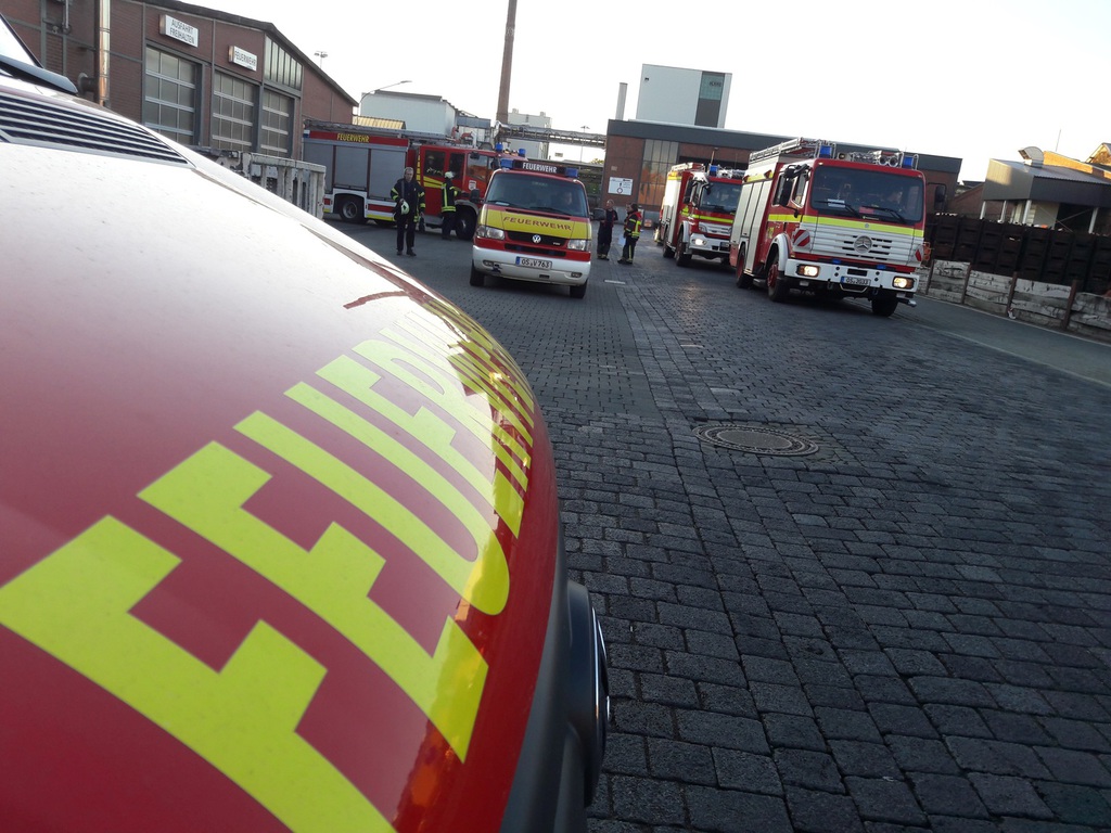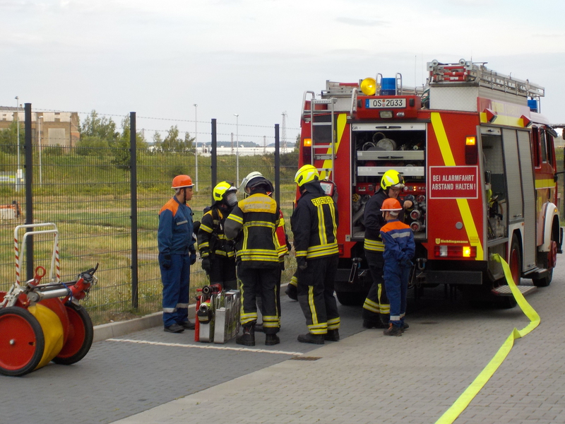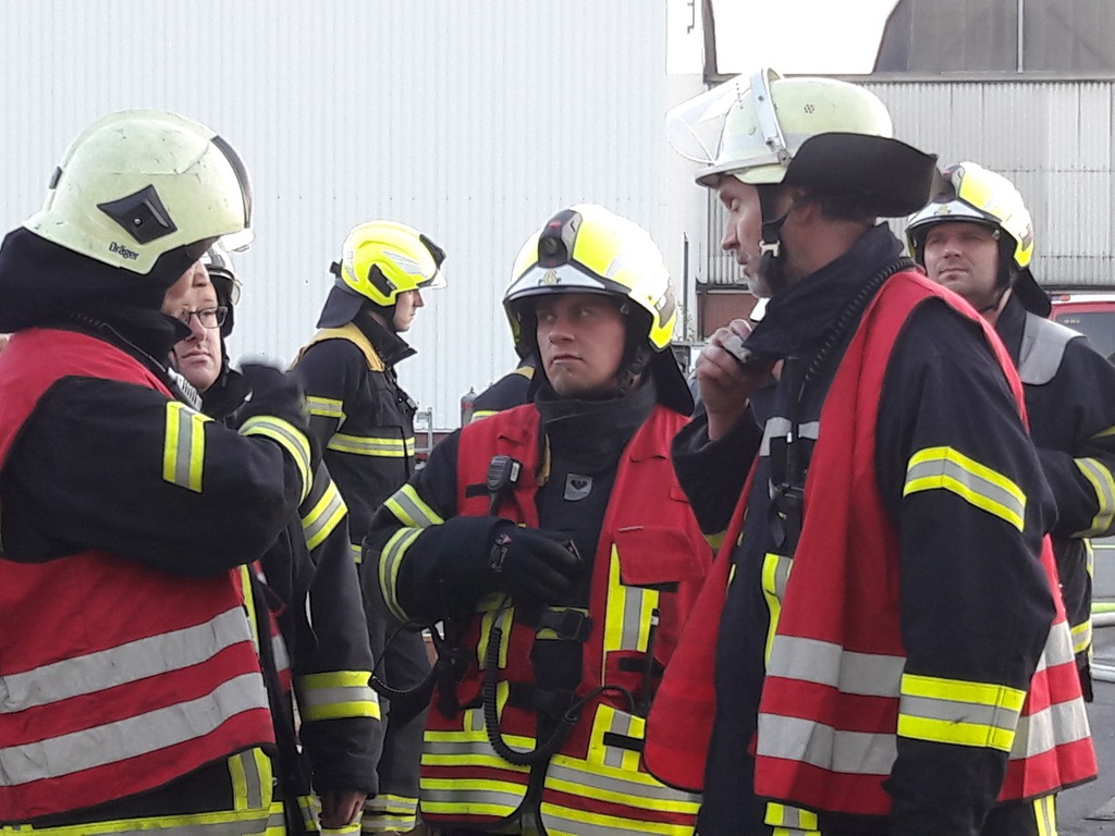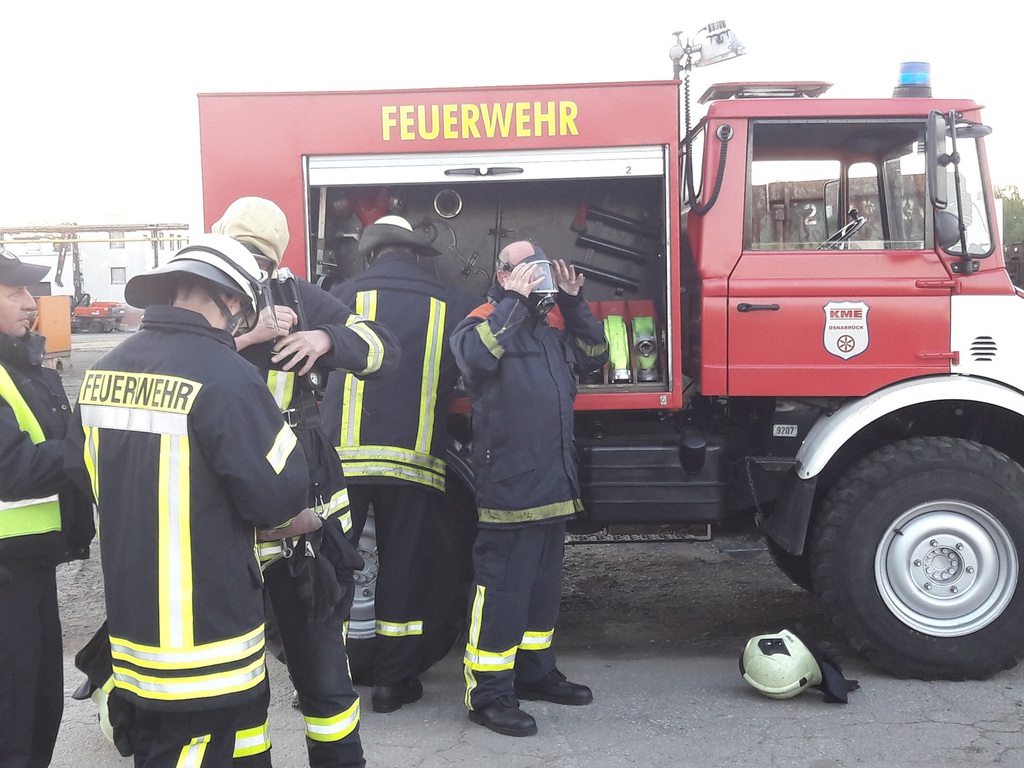 So lautete die Einsatzmeldung für die WF KME und die FF Schinkel bei einer gemeinsamen Übung auf dem Werkgelände der Firma KME Germany GmbH & Co.. Ausgangslage war eine Explosion durch Schweißarbeiten im Kellergeschoss einer Halle in der alte Maschinen abgebaut wurden. Zudem gab es mehrere Verletzte und vermissten Personen, sowie einen Brand mit Flammenbildung bis in das Flachdach. Nachdem zuerst die Werkfeuerwehr mit allen verfügbaren Fahrzeugen ausgerückt war und vor Ort einen ersten Löschangriff ins Innere aufgebaut hatte, stieß einige Minuten später die FF Schinkel dazu und unterstützte die Maßnahmen mit 3 Fahrzeugen und ca. 20 Leuten. Vorrangig galt es 4 vermisste Personen im Kellerbereich zu finden und diese schnellstmöglich nach draußen ins Freie zu bringen. Dazu wurden insgesamt von beiden Wehren 6 Atemschutztrupps mit 2 C-Rohren eingesetzt. Außerdem wurde zeitgleich über 2 tragbare Leitern und einem Teleskopmast der WF ein Außenangriff auf das Flachdach gestartet. Um die Wasserversorgung sicherzustellen wurde jeweils zum LF der Werkfeuerwehr und zum TLF Schinkel eine ca. 100 Meter lange B-Leitung aus 2 verschiedenen Richtungen verlegt. Während die ersten beiden vermissten Personen relativ zügig aufgefunden werden konnten, dauerte dieses bei den beiden weiteren eine etwas längere Zeit da sich der Bereich über 200 Quadratmeter erstreckte und zudem Nullsicht durch starke Verrauchung herrschte. Letzten Endes konnten aber auch diese gefunden werden. Das Feuer konnte in der Zwischenzeit ebenfalls im Innen- und Außenangriff abgelöscht werden, so das nur noch Lüftungsmaßnahmen in einem Teilbereich gemacht werden mussten. Kurze Zeit später konnte dann auch das Übungsende ausgerufen werden. Nachdem alles wieder abgebaut worden war, trafen wir uns noch zu einer Nachbetrachtung bei einem kühlen Getränk in der Fahrzeughalle der Werkfeuerwehr KME.