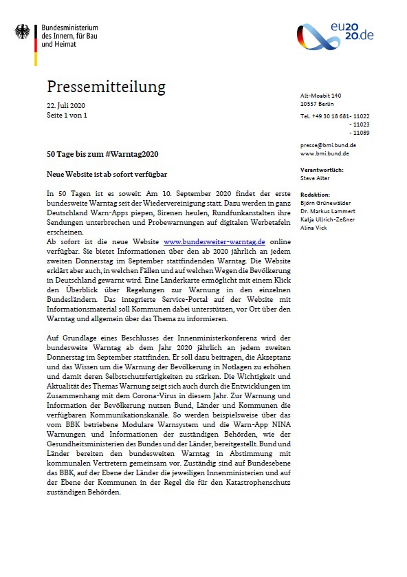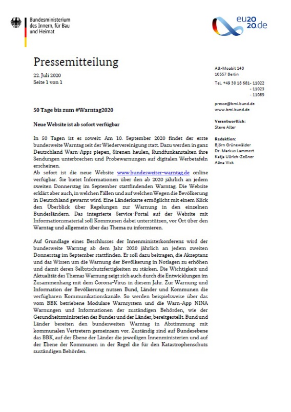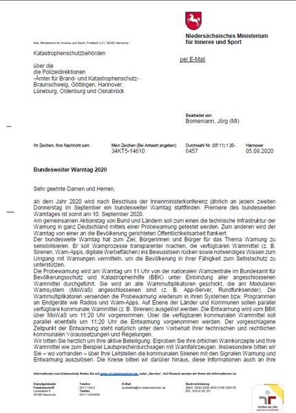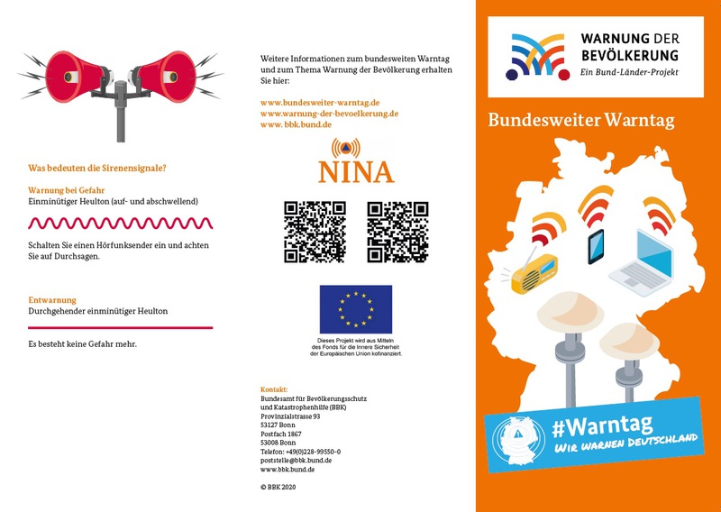 Am Donnerstag, 10. September, ist übrigens bundesweiter Warntag. Am gemeinsamen Aktionstag von Bund und Ländern werden in ganz Deutschland sämtliche Warnmittel erprobt. Pünktlich um 11 Uhr werden